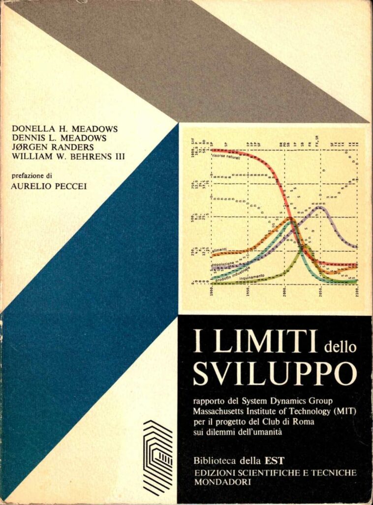 Copertina della prima edizione de “I limiti dello sviluppo” di Donella H. Meadows, Dennis L. Meadows, Jorgen Randers, William W. Behrens III, pubblicato dal Club di Roma nel 1972 in italiano