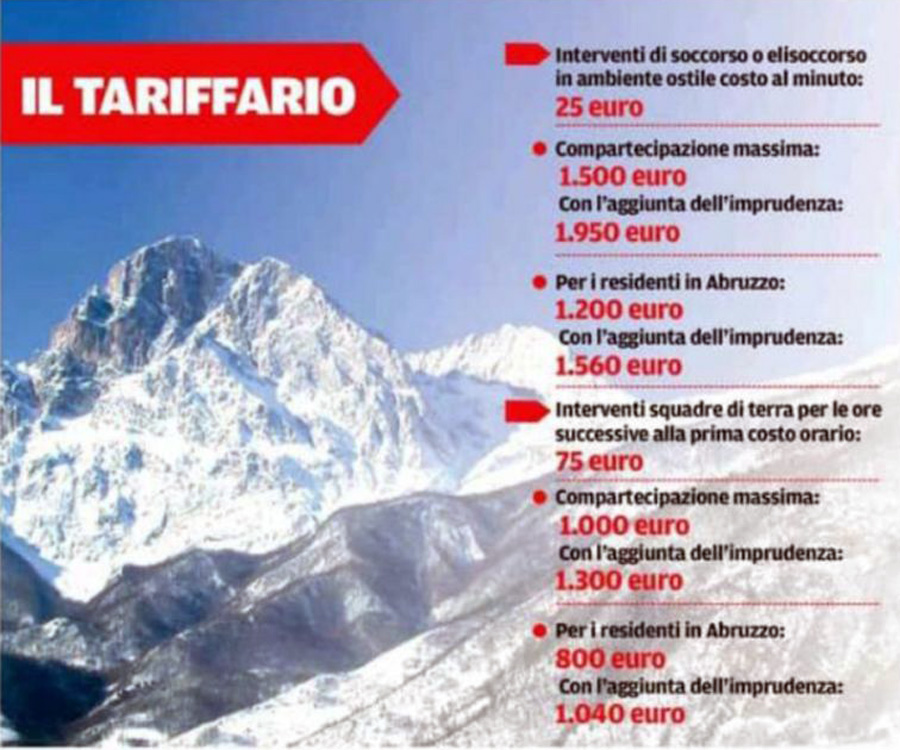 La delibera approvata dalla giunta Marsilio fissa il massimale della multa a quasi 2mila euro, con una riduzione del 20% nel caso in cui a dover pagare sia un abruzzese. Più nello specifico, l’obbligo di partecipare alle spese scatta nei casi di «interventi di soccorso “comprensivi di recupero e trasporto» in cui «non sussista la necessità di accertamento diagnostico o di prestazioni sanitarie in un pronto soccorso», si legge nel documento. È previsto, poi, un aggravio «qualora sia ravvisata imprudenza da parte dell’utente» che ha richiesto aiuto. Tradotto in numeri, gli interventi di soccorso e di elisoccorso costeranno 25 euro al minuto, fino a un massimo di 1.500 euro (1.200 per gli abruzzesi), che può salire a 1.950 in caso di comportamenti sconsiderati. Il corrispettivo per gli interventi delle squadre di terra, invece, sarà di 75 euro all’ora per tutte le ore successive alla prima, fino a un massimo di mille euro (1.300 con l’inasprimento della sanzione). Le spese rimangono a carico del servizio sanitario nel caso in cui le operazioni siano disposte «dalla centrale operativa di soccorso, se «sussistono condizioni di emergenza/urgenza, diverse dalla necessità di soccorso di soggetti in conclamato o imminente pericolo ambientale ma che al momento della chiamata siano incolumi» e se «le condizioni del paziente non permettono altro tipo di trasporto che quello in elicottero». Così come saranno a carico delle casse pubbliche anche gli interventi in cui il trasporto «è diretto all’ospedale» o se «è seguito da ricovero ospedaliero o accertamenti al pronto soccorso».
