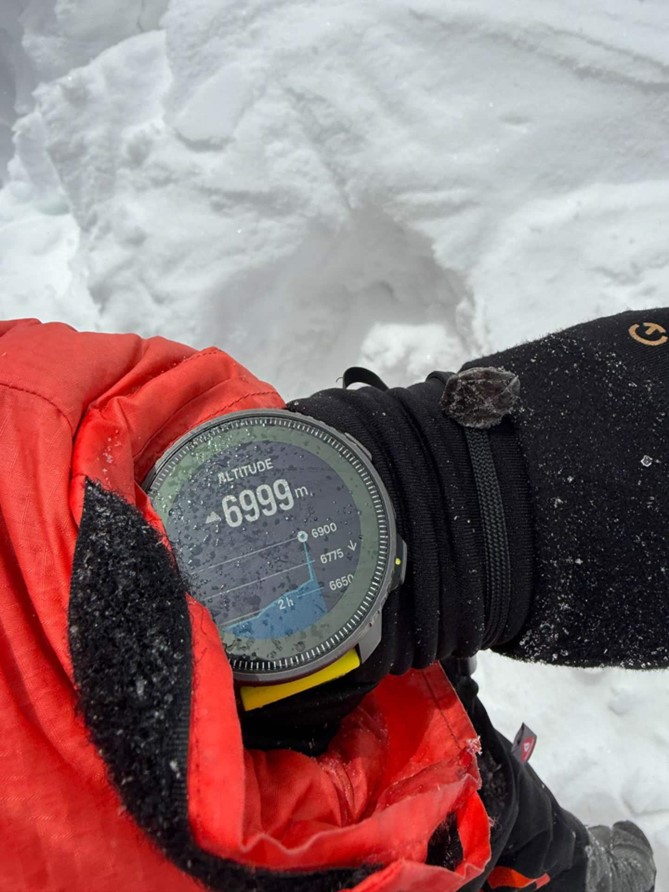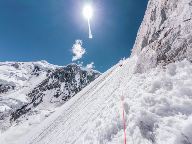 Ma sotto la cornice sommitale, c’erano davvero 50 metri di neve che non si era staccata, che pendeva. Ci siamo arrampicati per 10 metri e ci siamo interrogati. Se la placca si fosse staccata, sarebbe stato il grande salto per tutta la parete sud-est. È stato un po’ frustrante, ma non troppo, eravamo contenti di aver scalato la via. Il mio obiettivo negli ultimi anni è stato quello di essere vivo prima di dare tutto, quindi è questo tipo di decisione che ti permette di fare alpinismo per molto tempo nella tua vita.