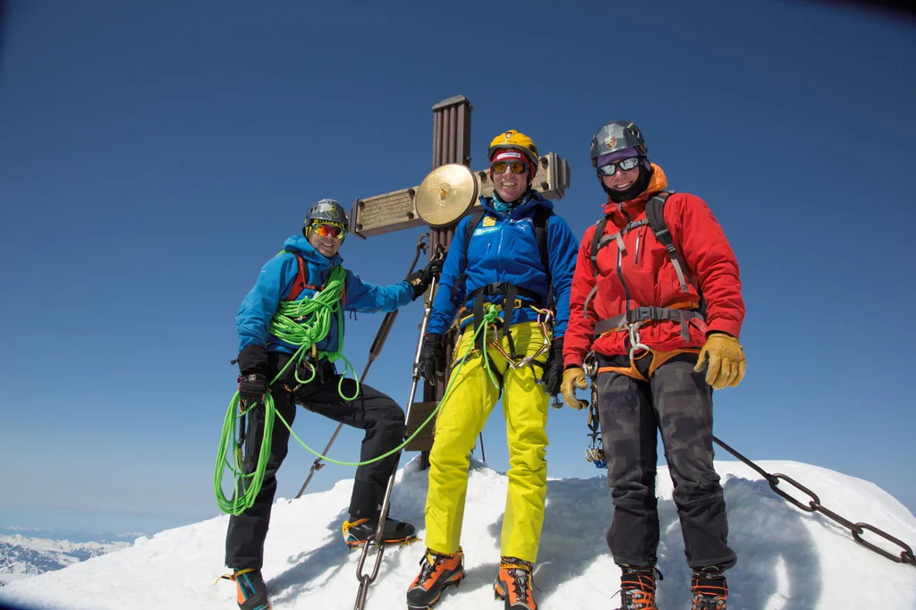 In vetta al Grossglockner, dopo aver salito la parete sud per la via Das 3. Leben, 14 aprile 2018. Bubendorfer è al centro, tra Hans Zlöbl e Max Sparber.