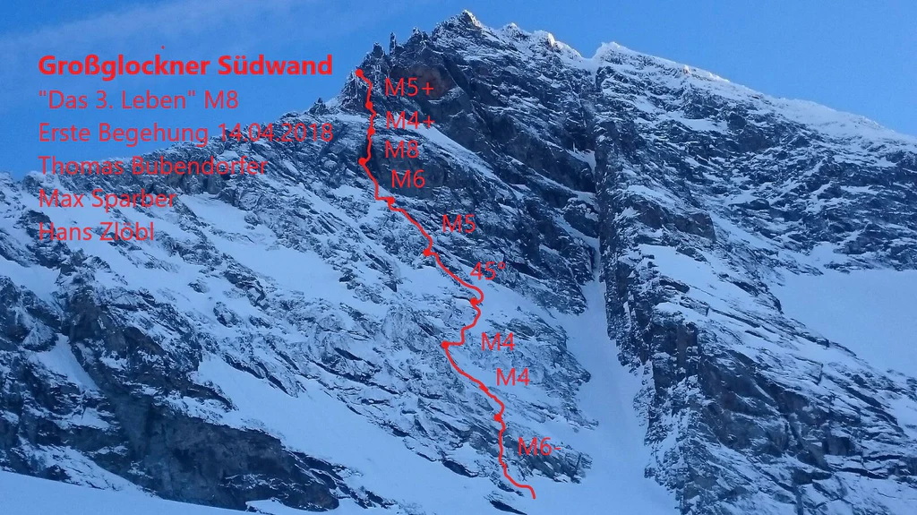 Per farla breve: dopo diversi tentativi (maltempo, troppa neve, valanghe, tempo buono ma burrascoso e troppo freddo, clima troppo caldo, ecc.), Hans Zlöbl, il mio amico Max Sparber e io abbiamo aperto sulla parete sud del Grossglockner, a marzo, un anno dopo la mia caduta di Sottoguda, una via di 9 tiri davvero impegnativa (M6-M8, Wi6) che abbiamo chiamato The Third Life. Ancora da ripetere.