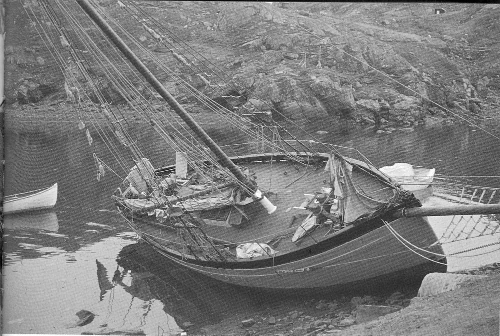 Il Mischief arenato nel porto di Angmagssalik nel giugno del 1964 dopo essere stato intrappolato nel ghiaccio