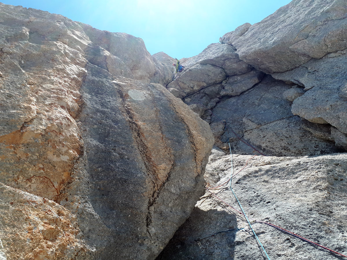 Dopo le uscite a Esigo e alla parete del Contrabbandiere (sotto al Lago di Cancano), scelte per la possibilità che danno di scalare sfuggendo al grande caldo estivo, il 19 giugno ci trovammo con Matteo Pellegrini, Stefano Romanengo e Giovanna Moltoni allo Zucco Barbisino (Piani di Bobbio) per fare la seconda salita di una via trad aperta da Ivo Ferrari, la via dei Nonni. Il tratto chiave della via era una fessura di una ventina di metri, completamente priva di spit o chiodi, data dal primo salitore di VI grado. Conoscendone la severità, affrontai quella fessura con timore reverenziale, ma ne fui abbondantemente premiato.
