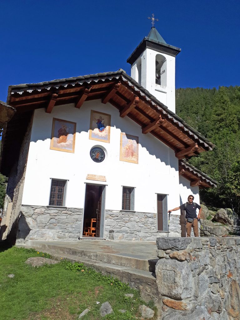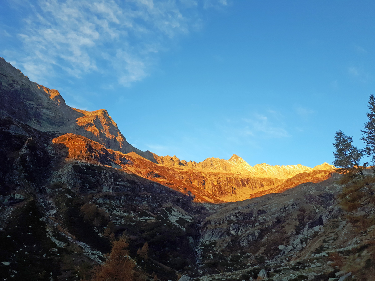 Con Achille Mauri avevamo concertato di fare un “corto” con tema “La Montagna Sacra”. Dopo la ricognizione del 30 settembre fino a Pian Lavina, condotta con Toni Farina, Luciano e Maura Heidempergher, ci tornammo, in pieno “foliage” in una serie di giornate radiose. Con noi, oltre a Toni, era la “protagonista” Flora Scacchi, una bambina di neppure sei anni accompagnata dallo zio Stefano Alba. L’avevamo scelta dopo un accurato “casting”. Dopo una bella cena a Ronco, il 26 ottobre salimmo filmando fino a Boschettiera, dove Luciano e Maura ci offrirono di passare la notte nella loro graziosa baita. Flora scese la sera stessa, ma noi volevamo riprendere l’alba sul Monveso di Forzo salendo a Pian Lavina ancora al buio. Il 27, aiutati da Mattia, un simpatico ragazzone anche lui proprietario di una bella casa in pietra a Boschettiera, salimmo a Pian Lavina e avemmo tutto il tempo di filmare un’alba spettacolare.