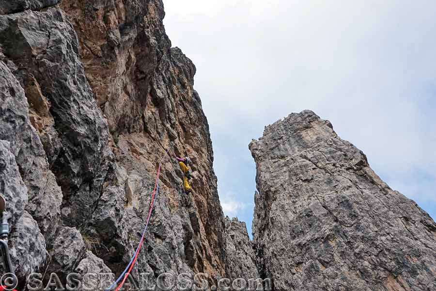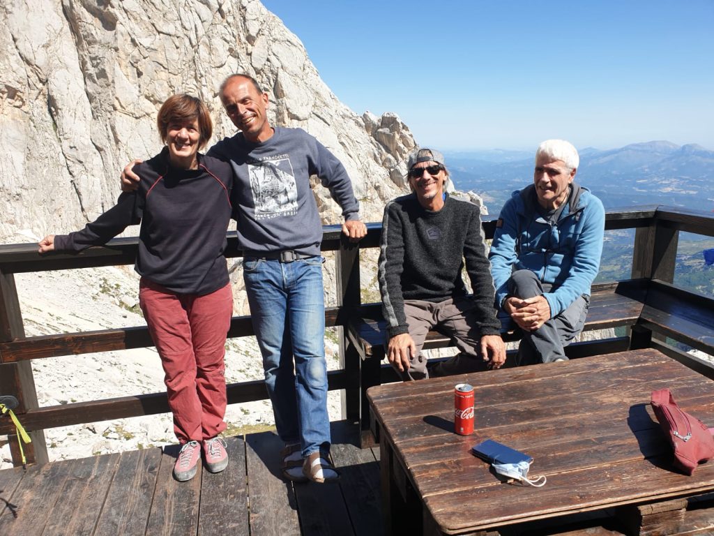 Tornammo in zona con Matteo il 26 giugno, per salire l’impegnativa e sottogradata via Buzzoni-Carì allo Zucco di Campelli. Dopo altre uscite a Roncobello e alla falesia di Ponte Campo (San Domenico di Varzo), il 10 luglio mi recai al Gran Sasso, in occasione del memorial a ricordo di Livia Garbrecht organizzato da Pasquale Iannetti. Mi vennero a prendere alla stazione di Giulianova e alla sera ero ai Piani di Tivo a presentare Molti friends e alcuni nuts assieme all’autore, Gianni Battimelli. Il giorno dopo ci recammo al rifugio Franchetti e al Campanile Livia. Assieme a me e Gianni erano anche Domenico Mimmo Perri, Andrea Di Bari e la moglie, il tenente colonnello dei Carabinieri Elena Candela. Gianni aveva dei problemi a un piede per un incidente che aveva avuto, perciò nell’avvicinamento era rimasto parecchio indietro a noi. Alla fine mi legai con Mimmo e, assieme ad Andrea ed Elena, attaccammo la classica via del Tetto, una via che inizia con una caratteristica fessura dove ci si deve incastrare. A comando alterno arrivammo in vetta e lì avemmo il piacere di incontrare Gianni, salito per la via normale da solo. Fu un momento assai bello (vedi i due brevi filmati qui sotto).