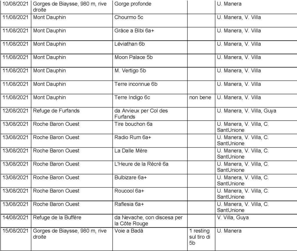 Dopo la vacanza di Mastellina fu la volta di Briançon: anche lì fummo ospitati da Ugo e Valentina per una settimana. Ci limitammo a qualche uscita in falesia (Gorges de Biaysse, Mont Dauphin, Roche Baron Ouest), ma per il resto grandi camminate. In una di queste (14 agosto) salimmo da Nevache al refuge de la Buffère. Ugo aveva preferito rimanere a casa. Dopo un piacevole pranzetto al rifugio, Valentina decise di effettuare la discesa tramite la non certo breve traversata necessaria per scendere fino a Nevache lungo la Côte Rouge. Il traverso si rivelò un saliscendi continuo su sentiero sconnesso. Questo mise a dura prova la resistenza di Guya, che dunque affrontò la ripida discesa della Côte Rouge con le ginocchia già a pezzi. Fu una specie di Beresina, ma alla fine ce la facemmo.
