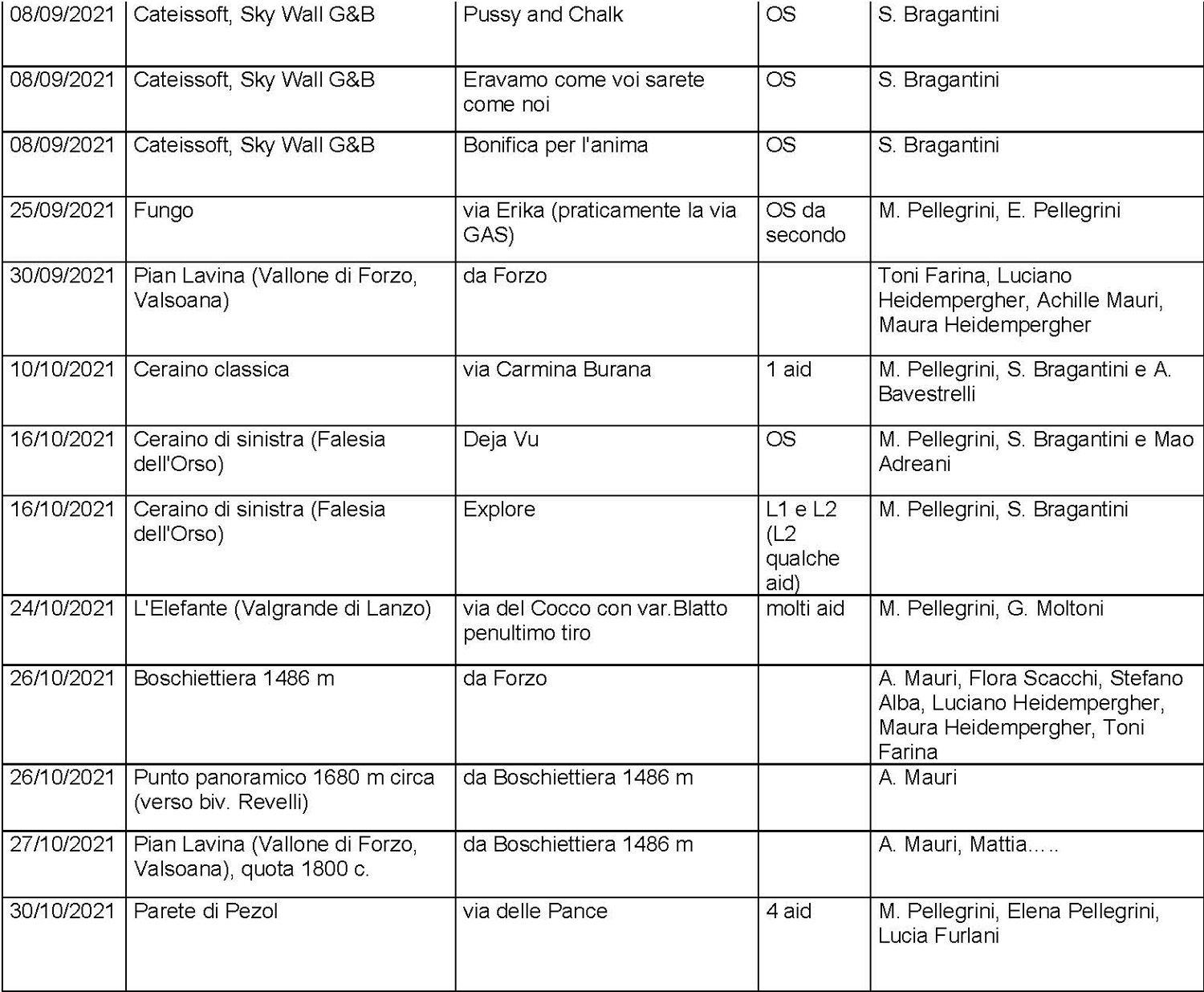 Dopo una bella uscita con Matteo ed Elena Pellegrini al Fungo (Grignetta, 25 settembre) per la via Erika (la vecchia via GAS), fu la volta sempre con Matteo (e con l’aggiunta di Andrea Bavestrelli e Salva) della via Carmina Burana (Ceraino classica, 10 ottobre); il 16 ottobre, Ceraino di sinistra (Falesia dell’Orso) con Matteo, Salva e Mao Adreani per la via Deja Vu e poi per le prime due lunghezze di Explore; quindi (24 ottobre) con Matteo e Giovanna Moltoni via del Cocco (con variante Blatto al penultimo tiro) all’Elefante (Valgrande di Lanzo), dove prendemmo alcune bastonate risolvendole in artificiale.