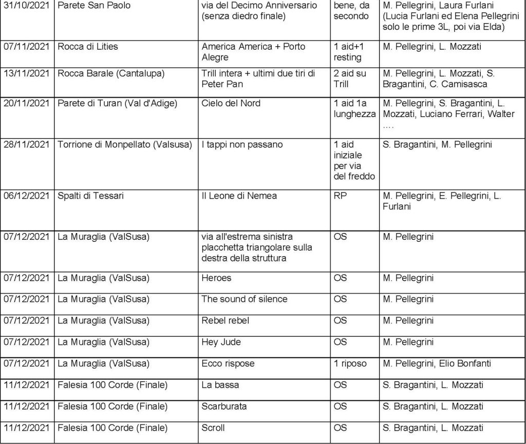Il 30 ottobre ripetei (con Matteo ed Elena Pellegrini e Lucia Furlani) la via delle Pance alla Parete di Pezol: qui salii molto meno bene della prima volta… Andò meglio il giorno dopo sulla via del Decimo Anniversario alla Parete di San Paolo. Il 7 novembre con Matteo e Luca Mozzati tornai alla Rocca di Lities in Valgrande di Lanzo, combinazione America America + Porto Alegre. Rimando alla tabella per le altre uscite, citando solo quella al Torrione di Mompellato (Valle di Susa) per la via I Tappi non passano con Salva e Matteo. Quindi salto al 18 dicembre, quando con Salva e Matteo, più Lorenzo Molinari e Luca Mozzati, sulla Bastionata di Tessari salimmo la classica Nebbie di Avalon.