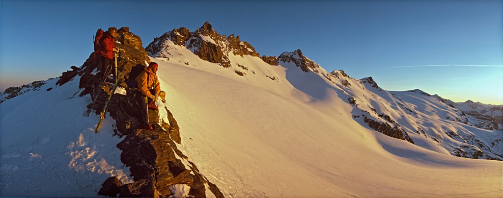Nel pomeriggio del 6 maggio 1998 partiamo per il refuge de la Dent Parrachée, carichi all’inverosimile e sotto un cielo ancora più scuro e nebbioso. Siamo accolti da Frederic Leviavant, cognato del custode: non c’è nessun altro, nel rifugio fa freddo, fuori è brutto. Non siamo molto entusiasti. In più Frederic ci comunica che al refuge de l’Arpont non c’è nessuno, quindi dobbiamo caricarci anche dei viveri per domani sera. La Dent Parrachée con il suo profilo dentellato e dolomitico non s’è fatta neppure vedere. Il mattino dopo, a notte fonda partiamo decisi perché finalmente è tutto stellato. La salita al Col de Labby non è una gran fatica anche se oltre al normale equipaggiamento da scialpinismo abbiamo con noi una quindicina di chili di materiale fotografico. Dopo un’alba mitica al colle, la discesa sul refuge de l’Arpont è fantastica: incontriamo anche un plotone di militari, in divisa rigorosamente bianca. Due parole di saluto, poi via verso il rifugio, dove in effetti saremo soli. La mia tracheite mi preoccupa.