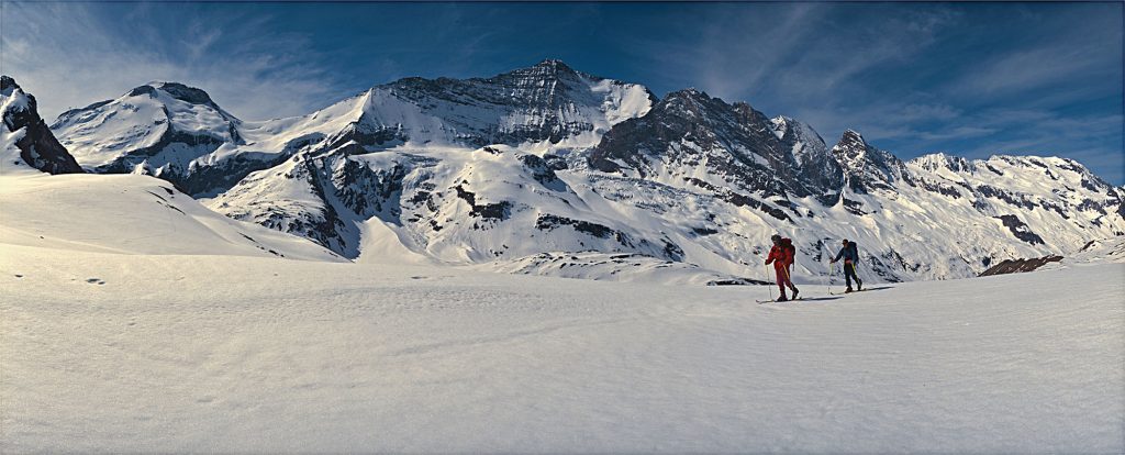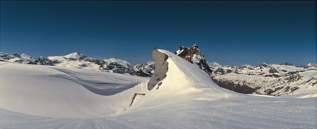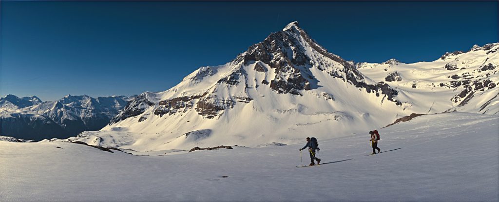 Il mattino dopo (9 maggio) ancora in marcia per il Col de la Grande Casse, sotto le splendide guglie della Grande Glière in un vallone stretto ed incassato. Dal colle, la visione sulla parete nord della Grande Casse, dove una cordata è impegnata a salire, ci ricorda l’alpinismo delle grandi pareti nord. Filiamo in discesa nell’alba dorata, passando sotto ai seracchi della parete, poi facciamo belle evoluzioni sul Glacier de Rosolin, fino alla sua fine. Dai pressi della morena destra saliamo ora su un ripido versante erboso, con gli sci in spalla, aggiungendo così peso ad altro peso per un totale insopportabile. La mattina è calda, la salita sulle nevi del Grand Plan fino al Col de la Croix des Frêtes è decisamente faticosa: vi arriviamo con distacchi di quarti d’ora, Benoît in testa. Le piste che da Col du Palet scendono a Tignes sono ormai chiuse e di neve marcia. Val Claret e Tignes ci appaiono per quello che sono, un’intrusione di brutto cemento in questa disastrata Val d’Isère. Ma le birre che ci beviamo al sole di un tavolino di bar sono degne compagne delle frîtes…