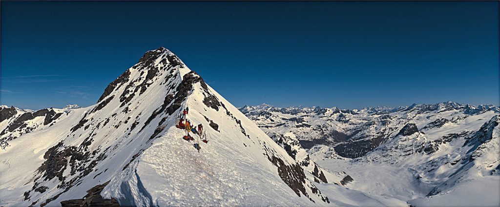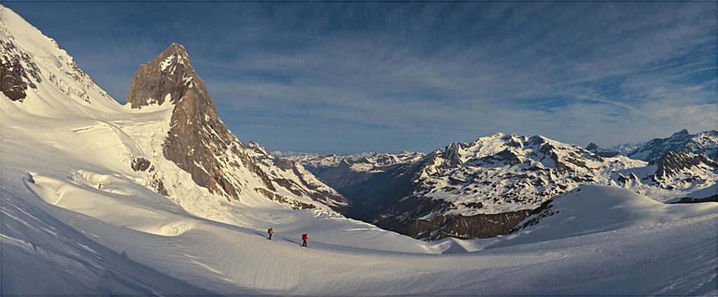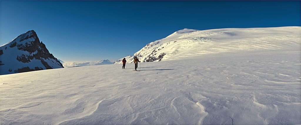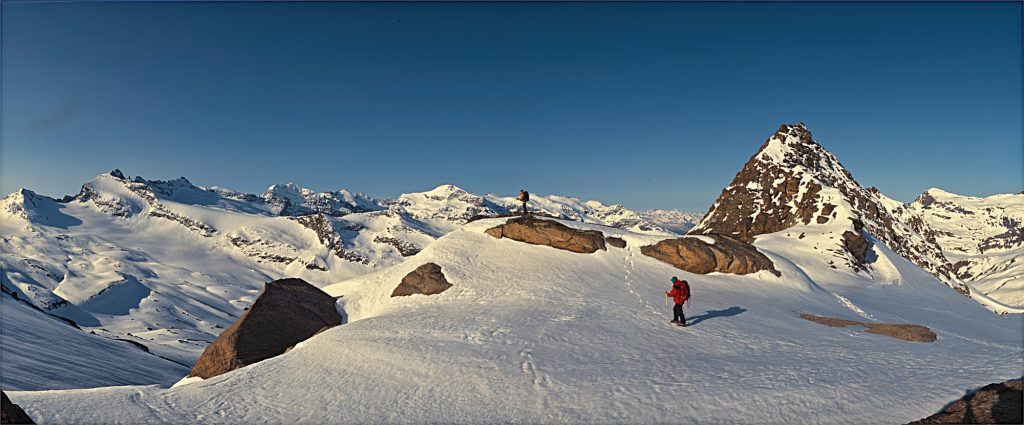Nella notte ci alziamo presto e vediamo che il cielo è di nuovo coperto. “C’est la lombarde” asserisce Benoît. Ma sappiamo che le previsioni sono buone, perciò partiamo ugualmente sui ripidi pendii che portano al Lac de Chasseforêt. Nebbia, disagio e venticello umido di lombarde ci accompagnano fino al primo chiarore di un’alba che invece si rivela di speranza. Il sole squarcia di prepotenza la nuvolaglia e di colpo la giornata diventa radiosa. Dopo le salite al Col Ouest du Pelve e al Col du Dard, sulle piatte distese di neve del Glacier de la Vanoise per la prima volta sento che forse ce la faremo. Sembra di essere in Groenlandia, sull’ice-cap. Raggiungiamo la Pointe du Dard e quindi per una discesa entusiasmante ci buttiamo sul refuge de la Vanoise, dove le marmotte vengono a mangiarti in mano. Il sole è abbacinante in questo pomeriggio di festa. Tanti stanno scendendo giù dalla via normale della Grande Casse: mi sembra un po’ tardi per avere neve decente e non pericolosa…