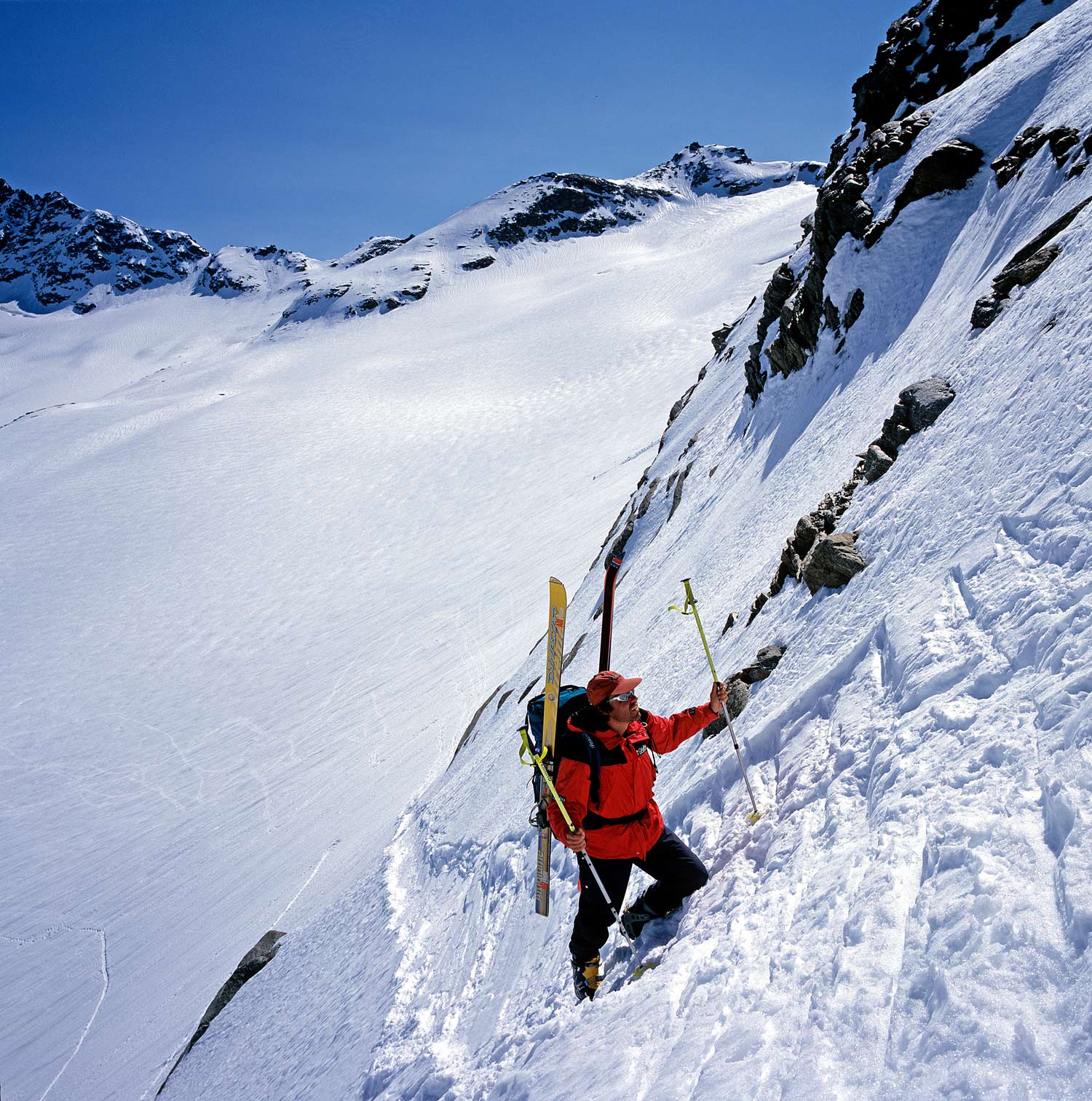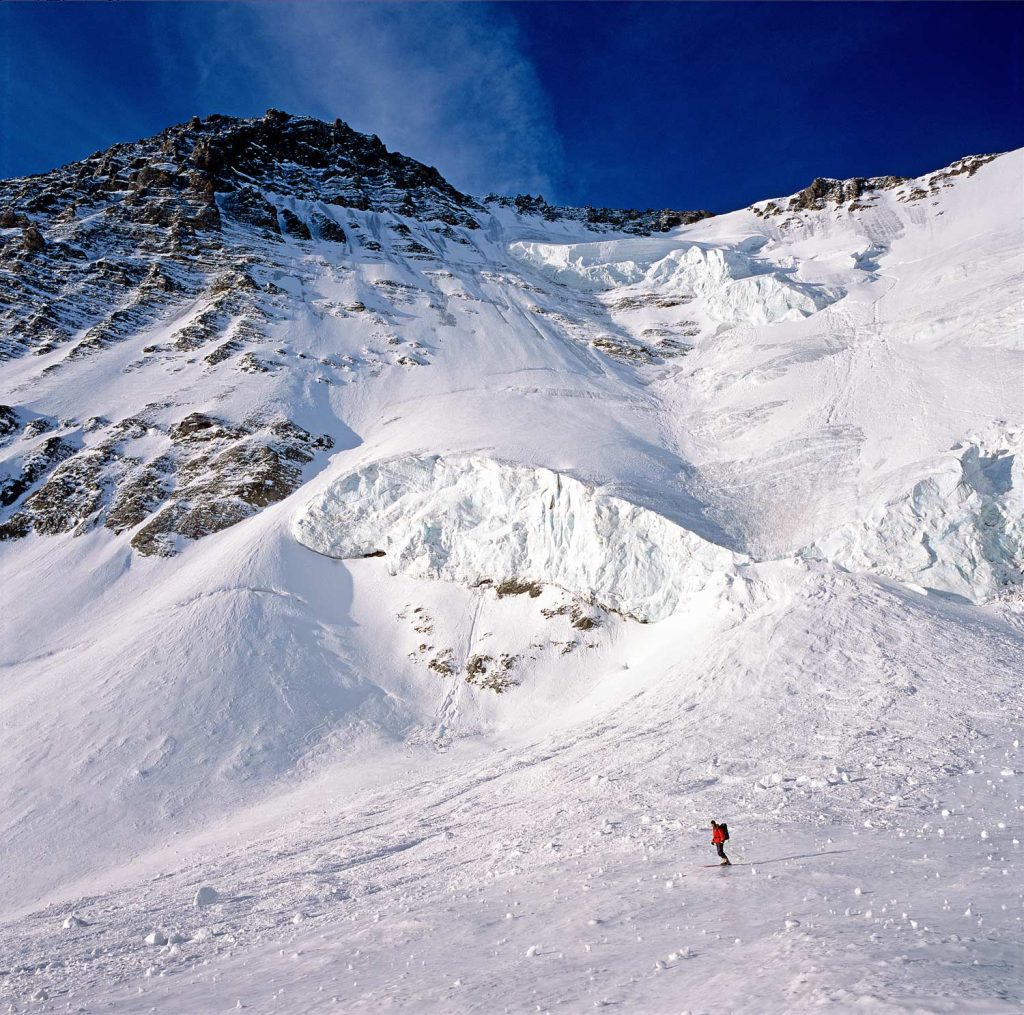 Nel pomeriggio del 6 maggio 1998 partiamo per il refuge de la Dent Parrachée, carichi all’inverosimile e sotto un cielo ancora più scuro e nebbioso. Siamo accolti da Frederic Leviavant, cognato del custode: non c’è nessun altro, nel rifugio fa freddo, fuori è brutto. Non siamo molto entusiasti. In più Frederic ci comunica che al refuge de l’Arpont non c’è nessuno, quindi dobbiamo caricarci anche dei viveri per domani sera. La Dent Parrachée con il suo profilo dentellato e dolomitico non s’è fatta neppure vedere. Il mattino dopo, a notte fonda partiamo decisi perché finalmente è tutto stellato. La salita al Col de Labby non è una gran fatica anche se oltre al normale equipaggiamento da scialpinismo abbiamo con noi una quindicina di chili di materiale fotografico. Dopo un’alba mitica al colle, la discesa sul refuge de l’Arpont è fantastica: incontriamo anche un plotone di militari, in divisa rigorosamente bianca. Due parole di saluto, poi via verso il rifugio, dove in effetti saremo soli. La mia tracheite mi preoccupa.