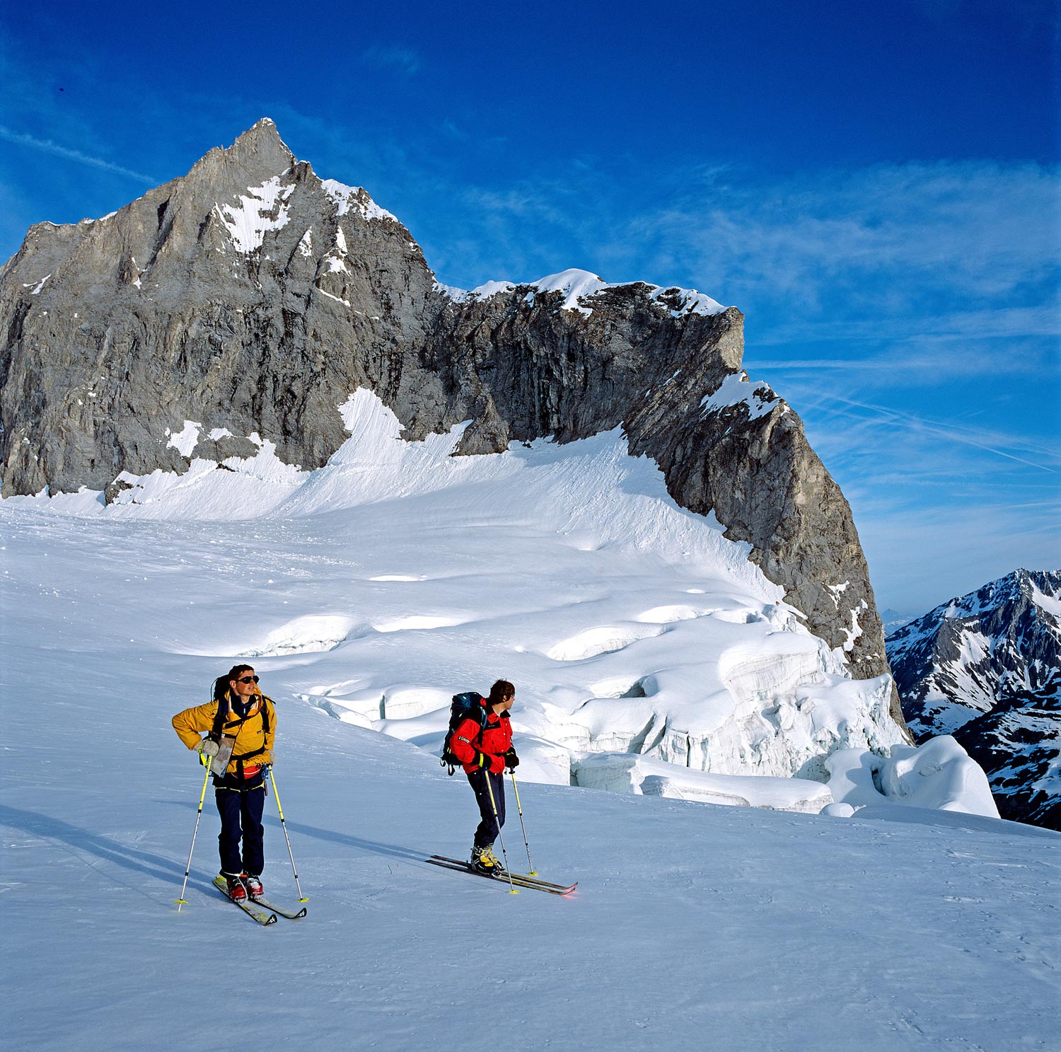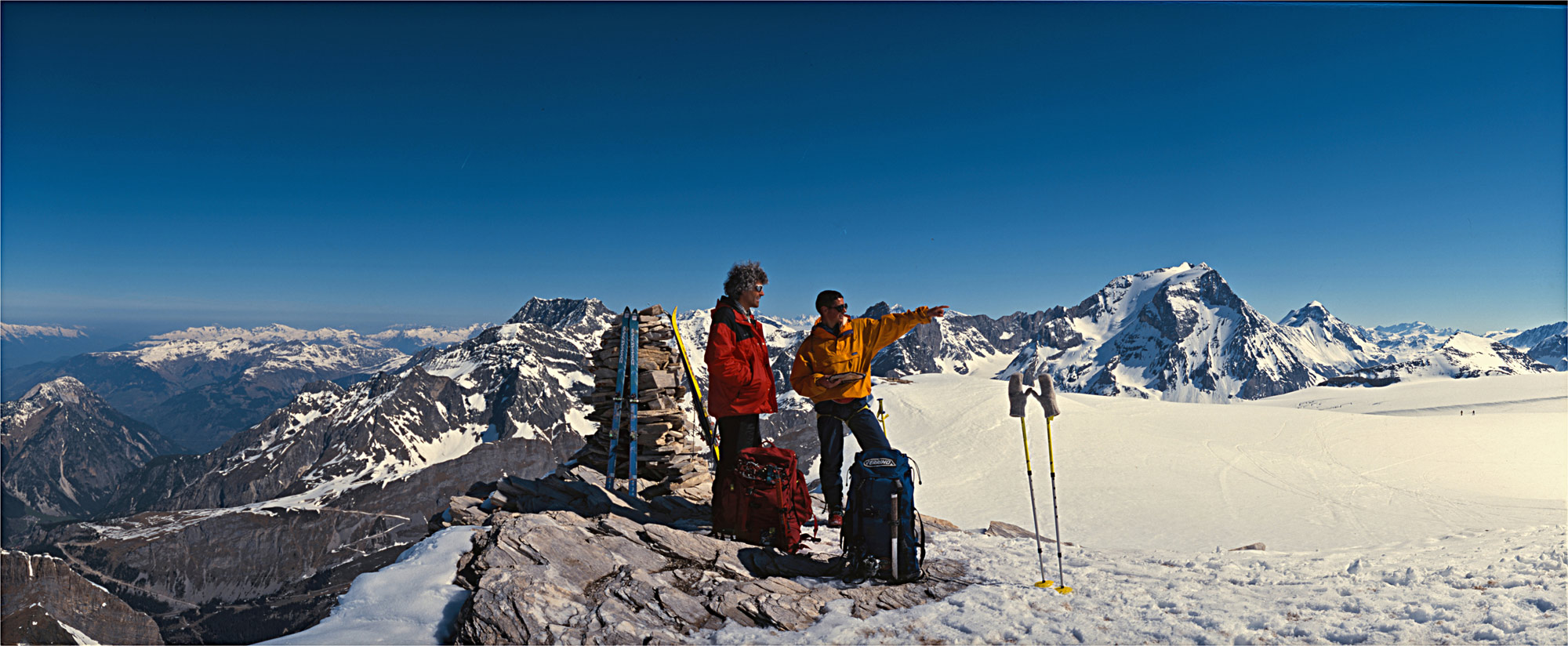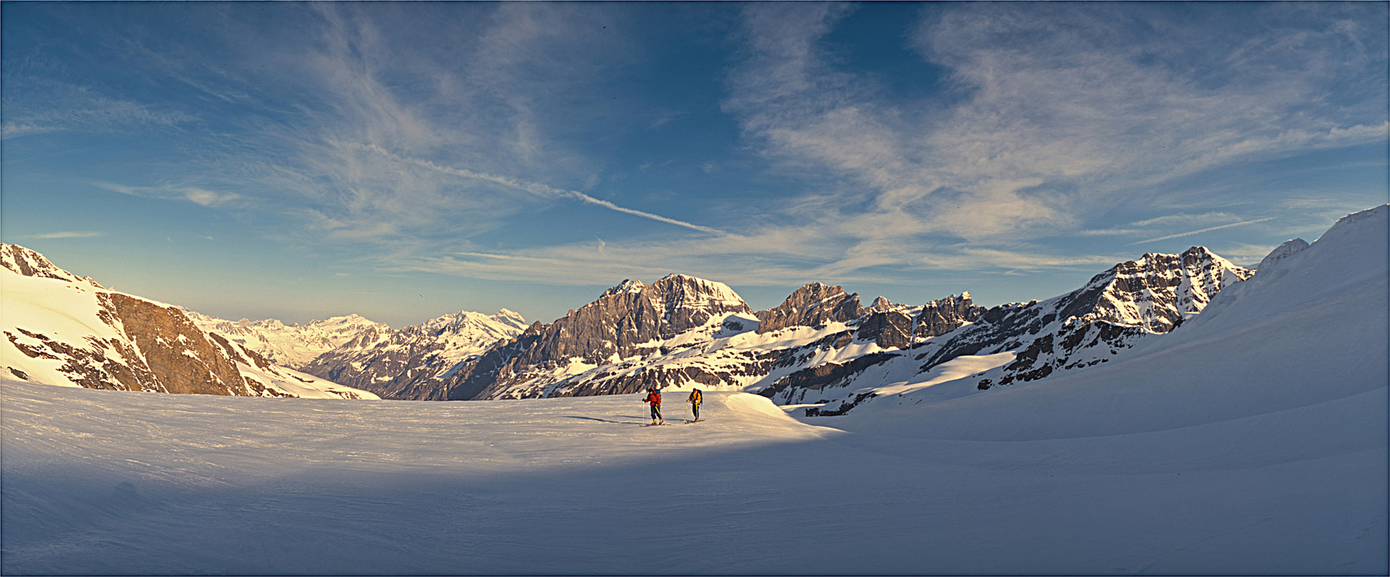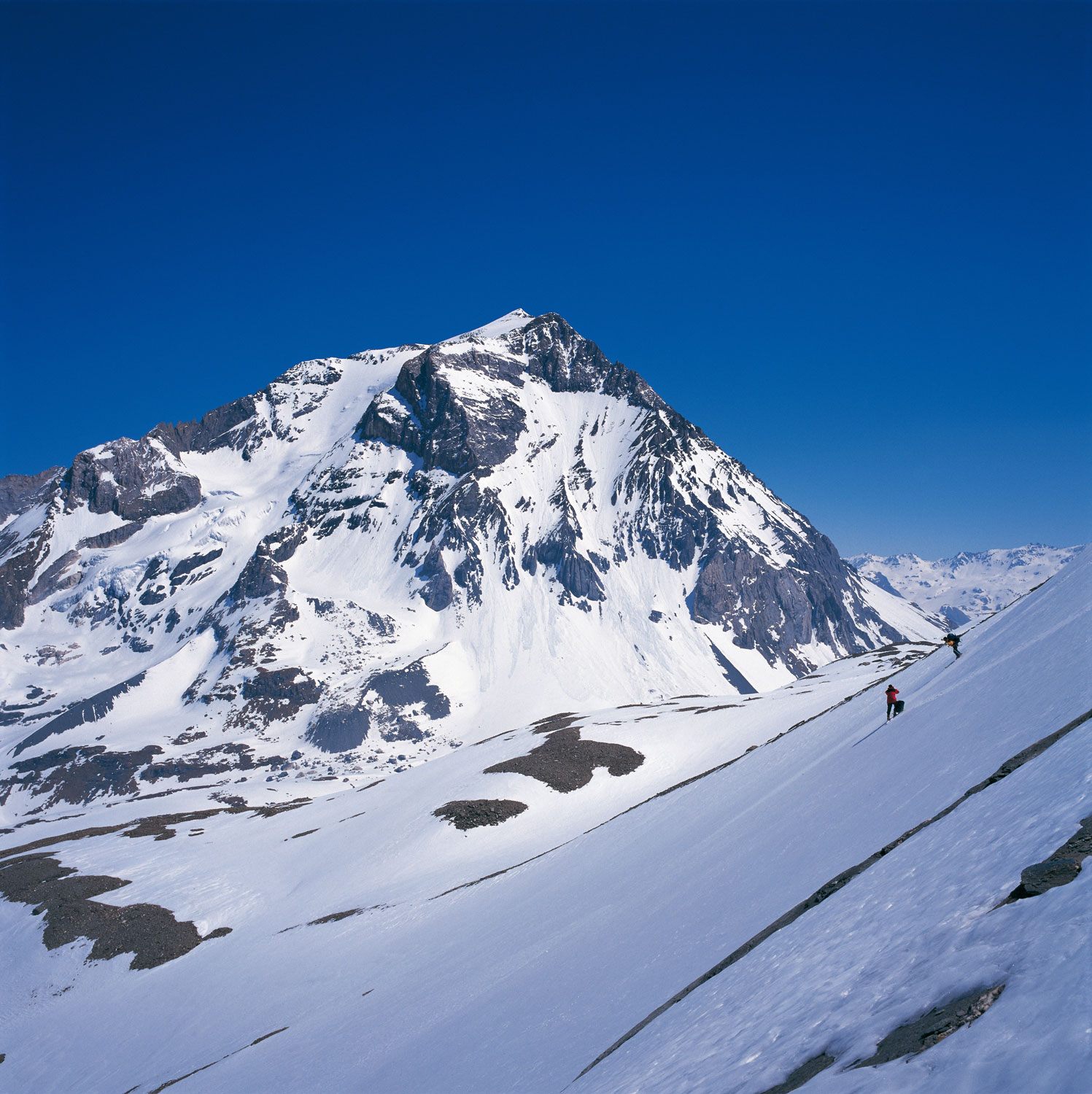 Il mattino dopo (9 maggio) ancora in marcia per il Col de la Grande Casse, sotto le splendide guglie della Grande Glière in un vallone stretto ed incassato. Dal colle, la visione sulla parete nord della Grande Casse, dove una cordata è impegnata a salire, ci ricorda l’alpinismo delle grandi pareti nord. Filiamo in discesa nell’alba dorata, passando sotto ai seracchi della parete, poi facciamo belle evoluzioni sul Glacier de Rosolin, fino alla sua fine. Dai pressi della morena destra saliamo ora su un ripido versante erboso, con gli sci in spalla, aggiungendo così peso ad altro peso per un totale insopportabile. La mattina è calda, la salita sulle nevi del Grand Plan fino al Col de la Croix des Frêtes è decisamente faticosa: vi arriviamo con distacchi di quarti d’ora, Benoît in testa. Le piste che da Col du Palet scendono a Tignes sono ormai chiuse e di neve marcia. Val Claret e Tignes ci appaiono per quello che sono, un’intrusione di brutto cemento in questa disastrata Val d’Isère. Ma le birre che ci beviamo al sole di un tavolino di bar sono degne compagne delle frîtes…