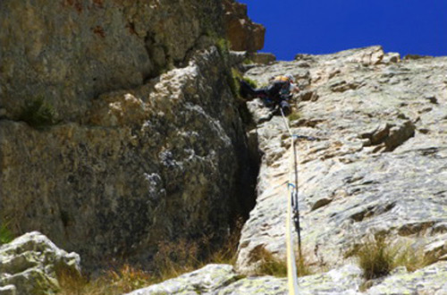 L5: spostarsi a sinistra della sosta per riprendere la fessura che sale sempre verso destra fino a raggiungere la cresta. Da qui a destra fino ad una parete giallastra. 35 m. 4c, 1 fix, 1 chiodo;