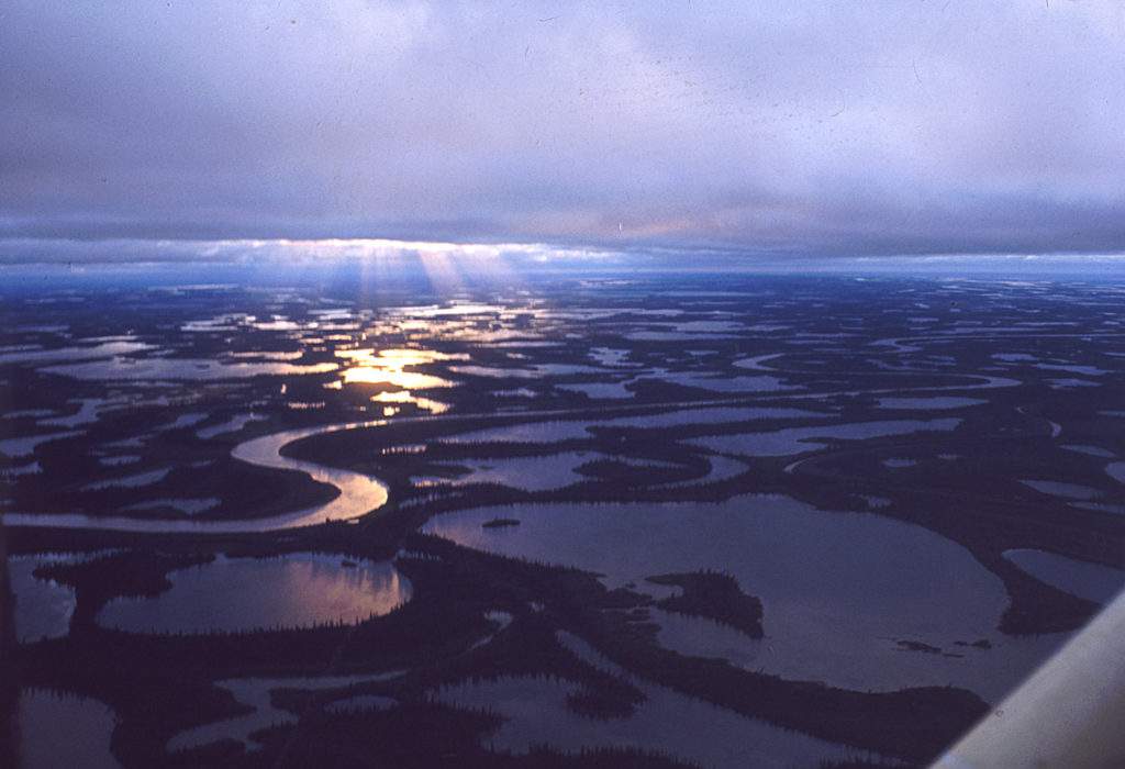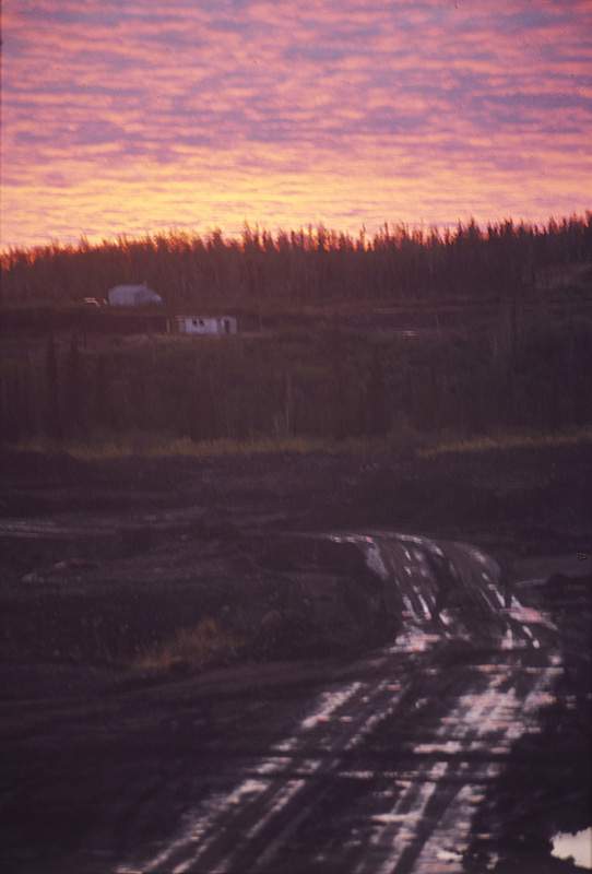 Se ci si allontana di qualche chilometro dal centro abitato ci si ritrova in un’immensa brughiera con tante colline basse e uguali. In lontananza a ovest i Monti Richardson limitano il delta del Mackenzie che di qui non si vede. Dappertutto tronchi abbattuti e bruciati con grossi cornacchioni che svolazzano sinistramente. Non si può camminare, il terreno cede sotto ai piedi, ogni tanto si sprofonda in un buco d’acqua o di fango. Se ci si imbatte in qualche valloncello, spesso si vede affiorare il ghiaccio nero. I tronchi delle conifere sono sottili e bassi: siamo ben distanti dalle grandi pinete dell’interno canadese.