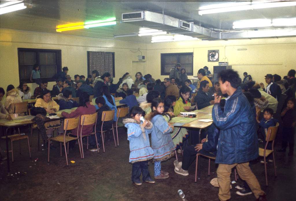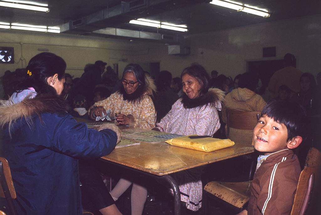 Passeggiamo a caso fra le case, ci spostiamo ognuno per proprio conto per poter vedere di più. Fa molto freddo e tira vento, il cielo resterà sempre grigio. I bambini giocano sempre, con un gran bel colorito sulle guance, e ti guardano passare sorridendo e ti gridano dietro “Give me a picture” e ti fanno il girotondo. Non esiste un’ora per andare a dormire, all’una di notte sono ancora tutti in piedi e corrono alle quattro estremità del villaggio. Di sera, quando non c’è il film, c’è il grande gioco del “bingo”, cioè la tombola. La maggior parte prende sei cartelle, puntando quindi tre dollari a partita. Però alcuni a volte giocano fino a 20 dollari. Le madri giocano con il bambino col cappuccio. La sala è piccola, piena di fumo e c’è molto chiasso.