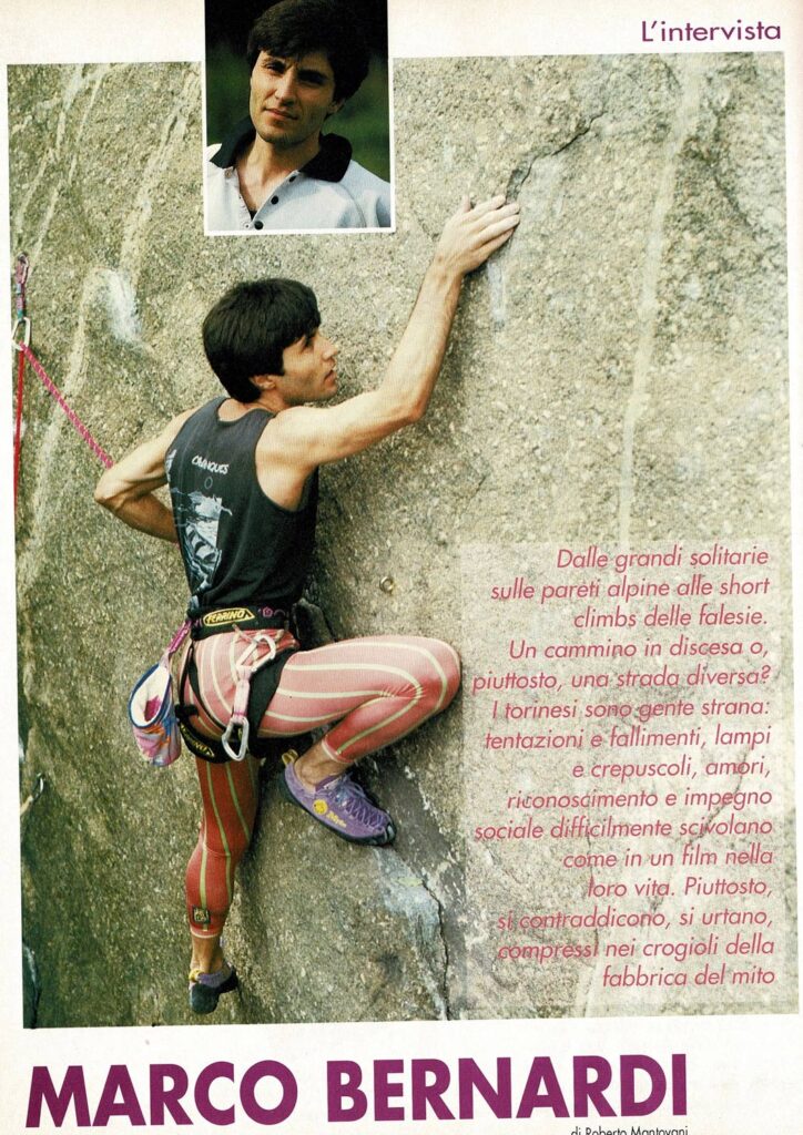 Marco Bernardi, trentaquattro anni (nel 1992, NdR), consulente informatico, un viso da ragazzino che denuncia a malapena l’età. Ex alpinista solitario, ex guida alpina, ex primo della classe in arrampicata libera (fino a qualche anno fa si chiamava ancora così), è stato uno degli inventori del free climbing di casa nostra e ha aperto la strada all’arrampicata sportiva dell’ultima generazione. Persino i climber “sintetici” e i patiti dell’indoor gli devono qualcosa. A lui, però, il ruolo del maestro sta stretto ed è convinto di non avere nulla da insegnare.