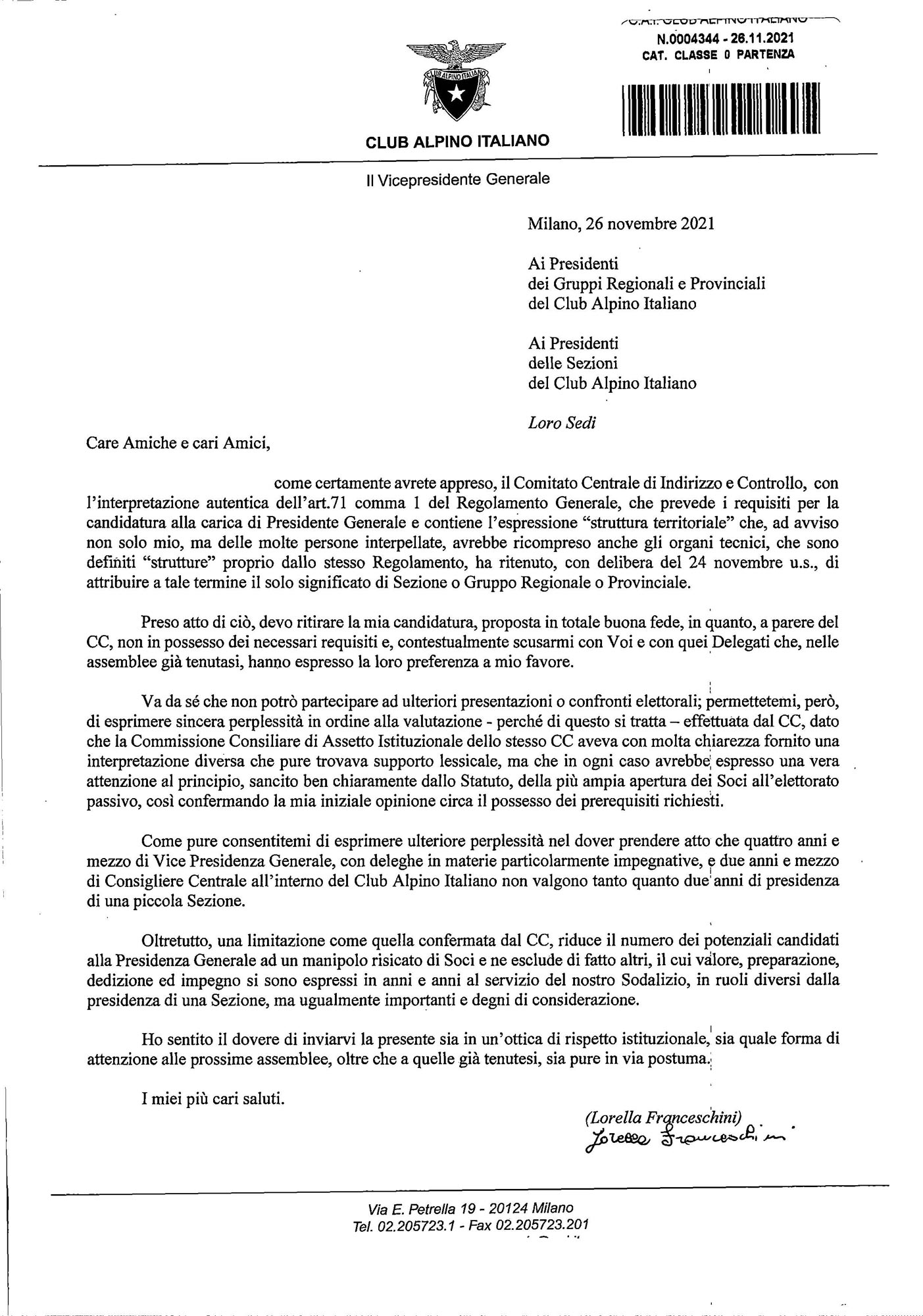 Care amiche e cari amici, siamo un gruppo di Soci che vogliono esprimere la propria indignazione, il proprio disagio e disappunto in merito a una decisione assunta dal Comitato Centrale di Indirizzo e Controllo (CCIC) nella seduta tenutasi in data 24 novembre 2021; in tale circostanza è stato deliberato in merito alla interpretazione autentica dell’art. 71 comma 2 del Regolamento Generale del CAI; tale articolo indica i requisiti che il candidato alla carica di Presidente generale deve possedere all’atto dell’elezione ovvero il candidato deve avere maturato esperienza negli organi centrali o alla presidenza di un Gruppo Regionale per un intero mandato e deve avere maturato esperienza pluriennale alla presidenza di una struttura territoriale del CAI; il Comitato Centrale di Indirizzo e Controllo (CCIC) ha interpretato che per struttura territoriale del CAI sono da intendersi solo le Sezioni e i raggruppamenti regionali. L’applicazione immediata di tale interpretazione ha impedito a Lorella Franceschini, candidata alla Presidenza generale per il triennio 2022/2024, di proseguire nel suo percorso elettorale, a campagna già avviata per la designazione dei candidati e con alcuni Gruppi Regionali che già si erano espressi a tal proposito; Lorella Franceschini è stata sì Presidente di un struttura territoriale quale la Commissione interregionale delle scuole di alpinismo, scialpinismo e arrampicata libera della regione Toscana ed Emilia Romagna, ma tale carica per effetto dell’interpretazione assunta non ha valore ai fini del possesso dei requisiti per la elezione a Presidente generale.