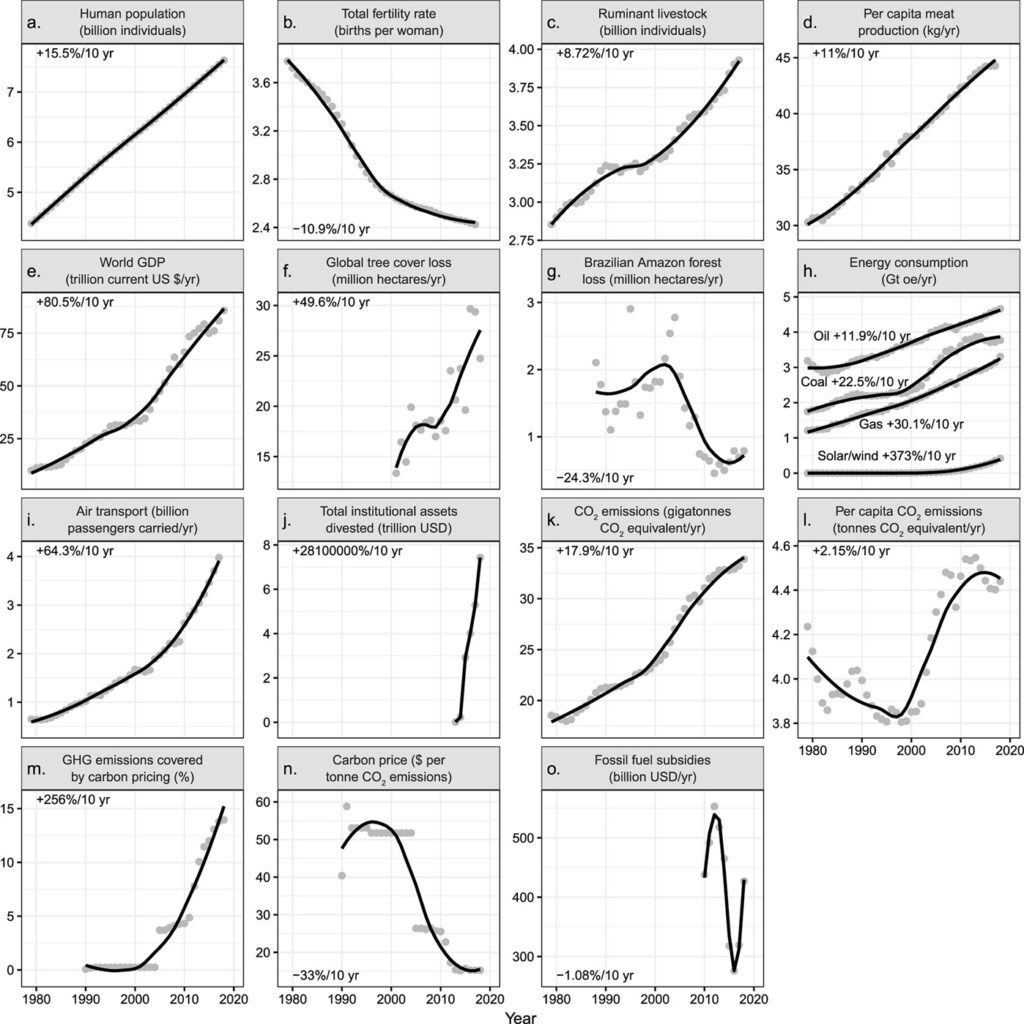 Profoundly troubling signs from human activities include sustained increases in both human and ruminant livestock populations, per capita meat production, world gross domestic product, global tree cover loss, fossil fuel consumption, the number of air passengers carried, carbon dioxide (CO2) emissions, and per capita CO2 emissions since 2000 (figure 1, supplemental file S2). Encouraging signs include decreases in global fertility (birth) rates (figure 1b), decelerated forest loss in the Brazilian Amazon (figure 1g), increases in the consumption of solar and wind power (figure 1h), institutional fossil fuel divestment of more than US$7 trillion (figure 1j), and the proportion of GHG emissions covered by carbon pricing (figure 1m). However, the decline in human fertility rates has substantially slowed during the last 20 years (figure 1b), and the pace of forest loss in Brazil’s Amazon has now started to increase again (figure 1g). Consumption of solar and wind energy has increased 373% per decade, but in 2018, it was still 28 times smaller than fossil fuel consumption (combined gas, coal, oil; figure 1h). As of 2018, approximately 14.0% of global GHG emissions were covered by carbon pricing (figure 1m), but the global emissions-weighted average price per tonne of carbon dioxide was only around US$15.25 (figure 1n). A much higher carbon fee price is needed (IPCC 2018, section 2.5.2.1). Annual fossil fuel subsidies to energy companies have been fluctuating, and because of a recent spike, they were greater than US$400 billion in 2018 (figure 1o).