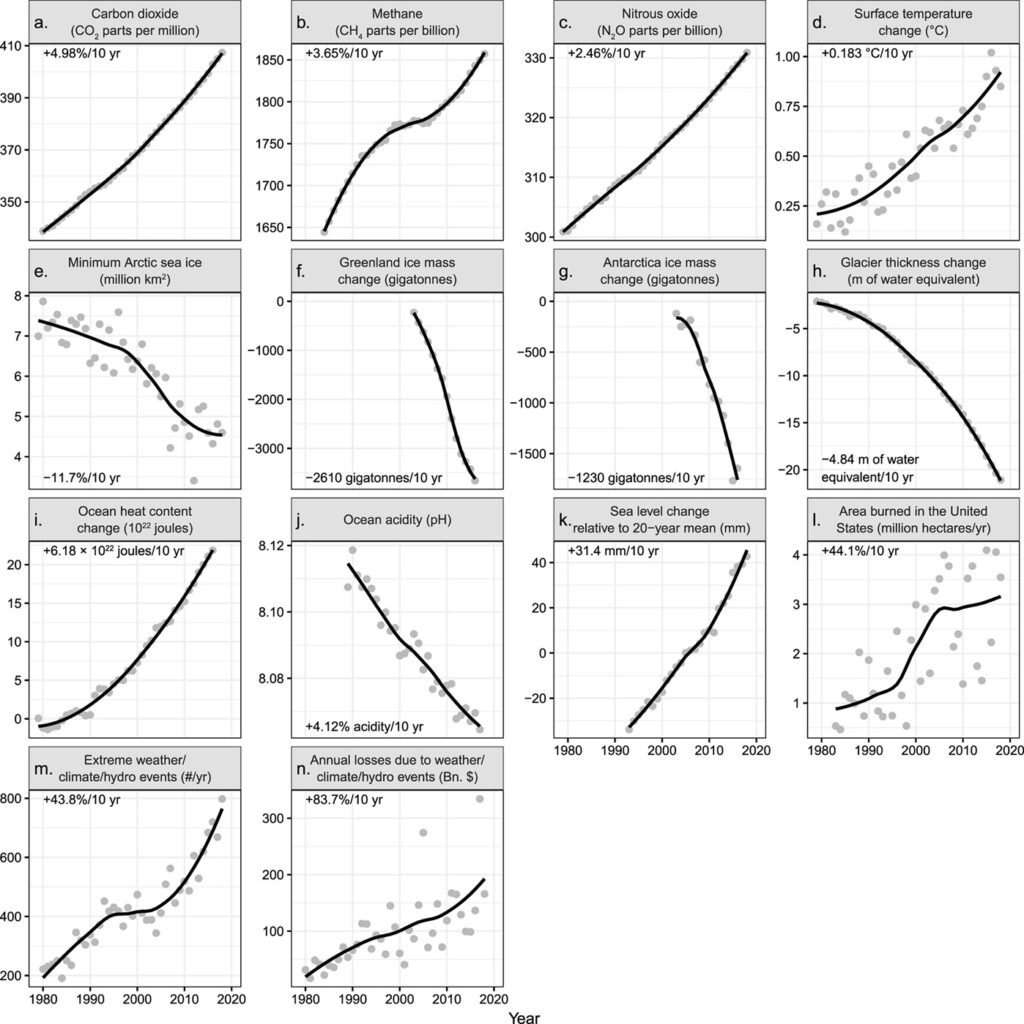 Especially disturbing are concurrent trends in the vital signs of climatic impacts (figure 2, supplemental file S2). Three abundant atmospheric GHGs (CO2, methane, and nitrous oxide) continue to increase (see figure S1 for ominous 2019 spike in CO2), as does global surface temperature (figure 2a–2d). Globally, ice has been rapidly disappearing, evidenced by declining trends in minimum summer Arctic sea ice, Greenland and Antarctic ice sheets, and glacier thickness worldwide (figure 2e–2h). Ocean heat content, ocean acidity, sea level, area burned in the United States, and extreme weather and associated damage costs have all been trending upward (figure 2i–2n). Climate change is predicted to greatly affect marine, freshwater, and terrestrial life, from plankton and corals to fishes and forests (IPCC 2018, 2019). These issues highlight the urgent need for action.